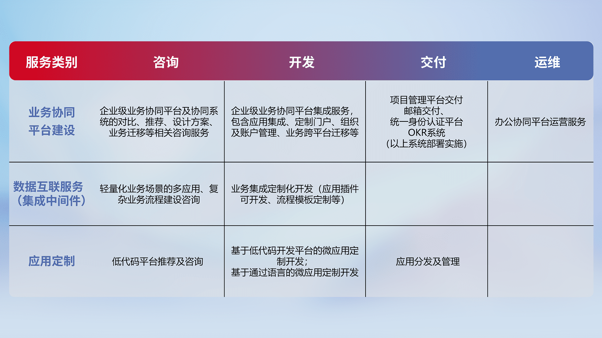 针对钉钉、、、企微、、IDaas等平台级产品提供产品的规划、、方案、、、交付、、、定制化开发等服务,,实现如统一协同办公、、、智能客户服务、、混合会议管理、、、智能数据查询、、等业务场景,,,实现数字化转型。。。。